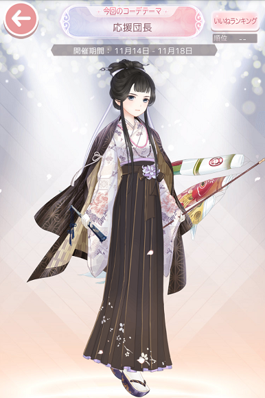 コーデお題「応援団長」 お題2017 2017年11月15日 Comment:0 暫く自由気ままにやり過ごしてきましたが また報酬欲しさに上位に入りたいと思いだしたのか久々に2パターン作ってみました。 (でもどっちもどっちだ順位伸びねー/(^O^)\) 団員は学ランで、団長は袴という画を思い浮かべて袴姿にしたのですが 会場では皆目見当たらなくてね…(淋しい) ところどころオカシイのはズバリなモノが無いせいです。 無いなりの工夫をお楽しみください…。 さてセルフィでの応援団長は… 白樹「主を差し置いて、我が団長に推されるとは僭越な…」 …いや学ランが似合わないと思ったまでだとはご本人に言えないのであるw 勢い余って自キャラで応援団を結成してしまいました。 ってくらい滾るテーマですなぁ!