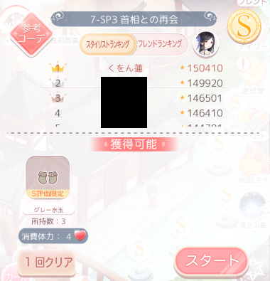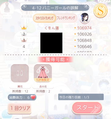 祝!スタイリストランキング1位 ミラクルニキ 2017年07月14日 Comment:0 通常クエスト疾走イベント(仮題)の走るネタが尽きたので 「ランキングに挑戦」のミッションをこなす事にしました。 まずはガール級。「ミリタリー」タグが要求されるステージ。 最新のミリタリー品「陸軍将校」をコンプしたので挑んでみたら獲れました。 「ノーザンの勇姿」の方が有利なようなのですが…作りにくくて ココをクリアする為に作った分しか持ってません。 「ノーザンの勇姿」品がメインで「陸軍将校」品で補ってコーデ組んだ、という感じです。 そしてプリンセス級。「バニー」タグが要求される魔のステージw 勝負的にもストーリー的にも印象に残るステージですよね…。 スタイリスト同士の得点が接戦なので、点数越えやすいかも~と思って挑んだら獲れました。 ショップ売りのアイテムが結構役に立ったように思います。 …と書くと簡単なように見えますが 自分に合ったステージを探すのと、運良く高得点を出すのとでかなり手間暇かかりましたので 今は1位獲りたい呪いが解けたと達成感に浸っております。 スキルは「ニキスマイル(レベルMax)」→「視線無効(レベル6)」→「眠りの呪い(レベル7)」 →「投げキッス(レベルMax)」→「ニキスマイル」と決めて運に任せてます。 反射神経鈍くて対応できないんだ(遠い目) レベル上げの為のコインも払えないですしね…。 上記のあと2つくらいはMaxにしたいと思いつつずっと見送り続けてます。 …そもそも攻略情報がっつり利用の賜物でありまして https://miramiku.github.io/Laurus/ 普段からこちら様を大いに利用させていただいております<(_ _)> 最強目指さずとも、自力で考えてコーデ組み立てるのって時間かかるので 時短になって大助かりですわ…。 以上、Twitterに報告しない自己満足記録(*´艸`)