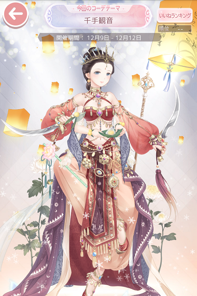 コーデお題「千手観音」 お題2017 2017年12月09日 Comment:0 こんなお題を出してくれる、ミラクルニキのセンスが大好きですヽ(゚▽゚)ノ 千手観音の事をググりつつ手持ちアイテムと相談した結果が以上です。 腕に関するアイテムは[ドレス・コート・手袋]の3パーツで計6本です。 あぁ後光がほしい。 某芸術団の舞踊「千手観音」とか好きです。 他人様のコーデを借りてツーショットが撮れる機能において「被せ行為」が問題となっているのですが あの舞踊のように、このコーデに腕増やしてくれるなら寧ろ嬉しかったりします← どちらが前でも構わないのでどうぞ遊んでやってください|д'*)ノ …と思ってコーデ日記にセーブしておきました。 さてセルフィでの千手観音は… それ相応のアイテムがあるので使いましたよ。 左はジャケットアイテム「剛力の四椀 赤(CQ)」、右は可動の背中アイテム「千手観音光臨 銀」 千手観音光臨は超あこがれていたあまり セルピットが掘り当てた「まばたきたそがれ 緑眼」と交換してもらった記憶があります。 (それらが当時、高い価値を誇っていた時代のおはなし…) …というくらい、神々しい雰囲気というものがワタシの好みでして。 そしてニキのように、千手観音とは全く無関係なアイテムを使って腕を増やしてみたら… 恋に悩む全ての人をすくう、ラブ千手観音像(モデルはA先生)が出来上がりました\(^o^)/ (赤い糸だのラブレターだの…たまたま恋に関するアイテムが集まってしまって すまん遊ばせてもらった!w) 腕に関するアイテムは[インナー・ジャケット・メガネ・手]の4パーツで計6本の模様。
