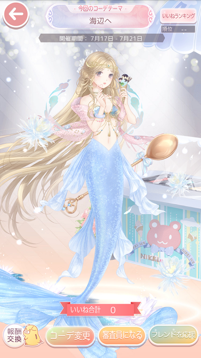 コーデお題「海辺へ」 お題コーデ2018下 2018年07月18日 Comment:0 海底から海辺へ…と思って、ここぞとばかりに初の人魚コーデ。 順位UPの為の再掲の際に現イベントのアイテムを足したので 海辺のアイス屋さんを訪れた人魚ちゃんになってしまいました← イベントのセットコーデの娘が実は人魚でした…みたいな事になったなと思い 比較として画像をペタリ。 イベントで得たメイクがとても 可愛いです。おちょぼ口好き。 品評会画面だと尾っぽが美しく見えないので、全身写した画像をペタリ。 最初にエントリーした時はこのようなコーデでした。 *** 楽しみにしていた学会(デザイナー協会)が、20日いよいよ来る…! 初めて作ろうと考えていた一生シリーズコーデも、一緒に来る…! 陰陽師×犬夜叉コラボで忙しいというのに/(^O^)\ 夏の暑さで参っているというのに、これ以上沸騰させてどうするんですかorz つい先日はセルフィの彼岸花ガチャで祭り状態でした。 コレちょっと早めに来てくれたの助かったな。