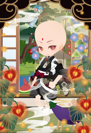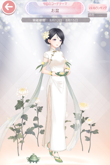 コーデお題「お盆」 お題2017 2017年08月12日 Comment:0 今イベントの、ちまき両手で持ったポーズアイテム使ってお供え物持っているようにしたくて… そうすると半袖~ノースリーブな衣装しか使えないですし(着物ボツ) 普通の洋服とも合いそうにありませんので、チャイナドレスでお参りとなりました。 中華圏のお盆(盂兰盆節)ですよ。中華圏の喪服は白ですよ。 日本だって昔、喪服といえば白(グレー)でしたが 明治時代以降の西洋化などから黒になっていったみたいなのですよ。 夫の葬儀に妻だけが白の喪服で"ニ夫は交えず"という意味を込めるというのもあるのですよ。 菊と香炉があるので別に黒に染まらずともご先祖参りだと伝わりそうですし 夏らしい色合いで良いんじゃないでしょうか(自己完結) そんなこんなで流行りの黒喪服ではありませんが 何故かTop10%前後で珍しく健闘中です。最新アイテムの力ですかねw 報酬の為に今回くらいはがんばってくれー!前回も結局 99%で撃沈したんだよorz さてセルフィでのお盆コーデは… まずはナスの牛が使いたくなり、日本のお盆を表現。 仏教の行事という事で地蔵菩薩もどきの九条を召喚しました。 一休さん(アニメ)の恰好をさせたくなりましたよ。 死者をお迎えする行事といえば、ウィレンは欠かせない…! 道教においても「中元節」という、同様の年中行事がある というか盂蘭盆会の方が後発らしいですな(ウィキペディア参照しながら) 日本でも中華圏でも、道教の中元節(お中元)と中国仏教の盂蘭盆会(お盆)が習合して 今の習慣となっているようです。 う~ん、伝統文化って奥深い。 ググって俄か知識仕入れながらコーデを考えていくのが楽しいのです。