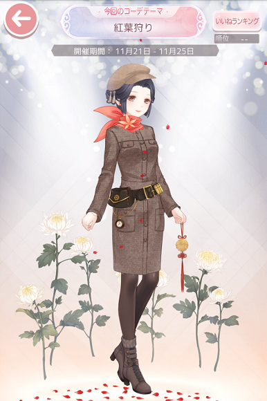 コーデお題「紅葉狩り」 お題2017 2017年11月22日 Comment:0 久々に現代的服装の組み合わせを楽しんでみたのですが… 表示不具合との闘い(構造上ありえないはみ出し、めり込み)が厳しくて じっくり練る時間が無いと納得のいくコーデが出来ません。 (長袖だとボディカテゴリーのショルダーバッグが皆目使えないとか泣きました) …セットコーデで済ましてしまう人が間々居るのも頷けるような気がしました。 課金すれば紅葉が手に入るのですが…頑張ってスルーします← さてセルフィでの紅葉狩りは… セレクト覚醒で出てくれた紅葉背景が重宝するのですが…飽きたので 前景を主役に、背景は敢えて単色グラデーションにしました。