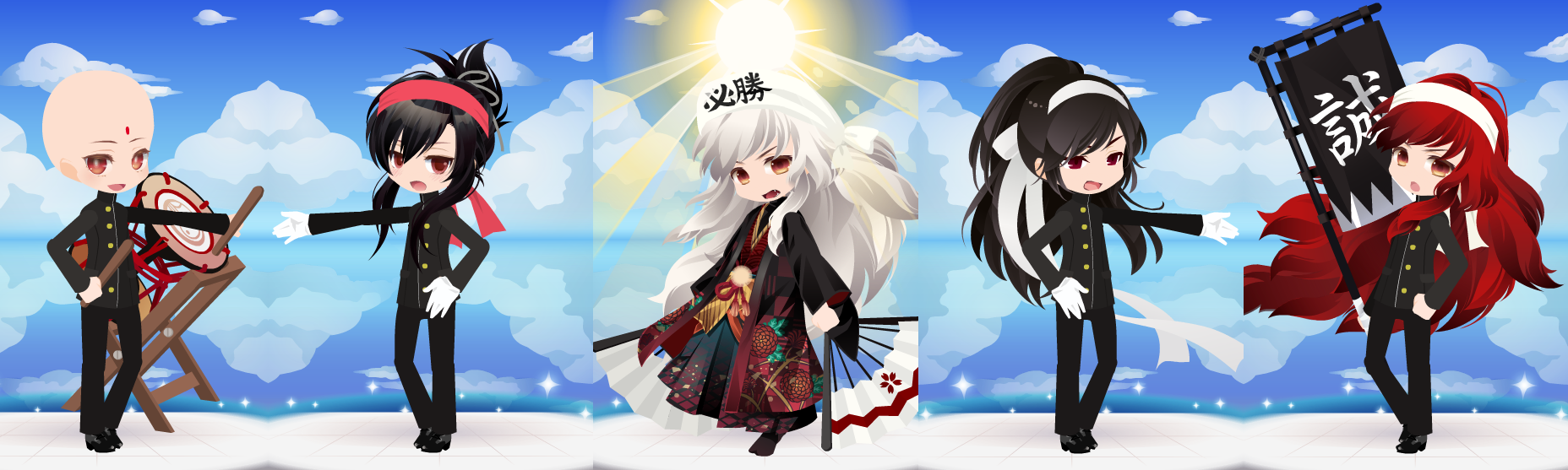 コーデお題「応援団長」 お題2017 2017年11月15日 Comment:0 暫く自由気ままにやり過ごしてきましたが また報酬欲しさに上位に入りたいと思いだしたのか久々に2パターン作ってみました。 (でもどっちもどっちだ順位伸びねー/(^O^)\) 団員は学ランで、団長は袴という画を思い浮かべて袴姿にしたのですが 会場では皆目見当たらなくてね…(淋しい) ところどころオカシイのはズバリなモノが無いせいです。 無いなりの工夫をお楽しみください…。 さてセルフィでの応援団長は… 白樹「主を差し置いて、我が団長に推されるとは僭越な…」 …いや学ランが似合わないと思ったまでだとはご本人に言えないのであるw 勢い余って自キャラで応援団を結成してしまいました。 ってくらい滾るテーマですなぁ!
