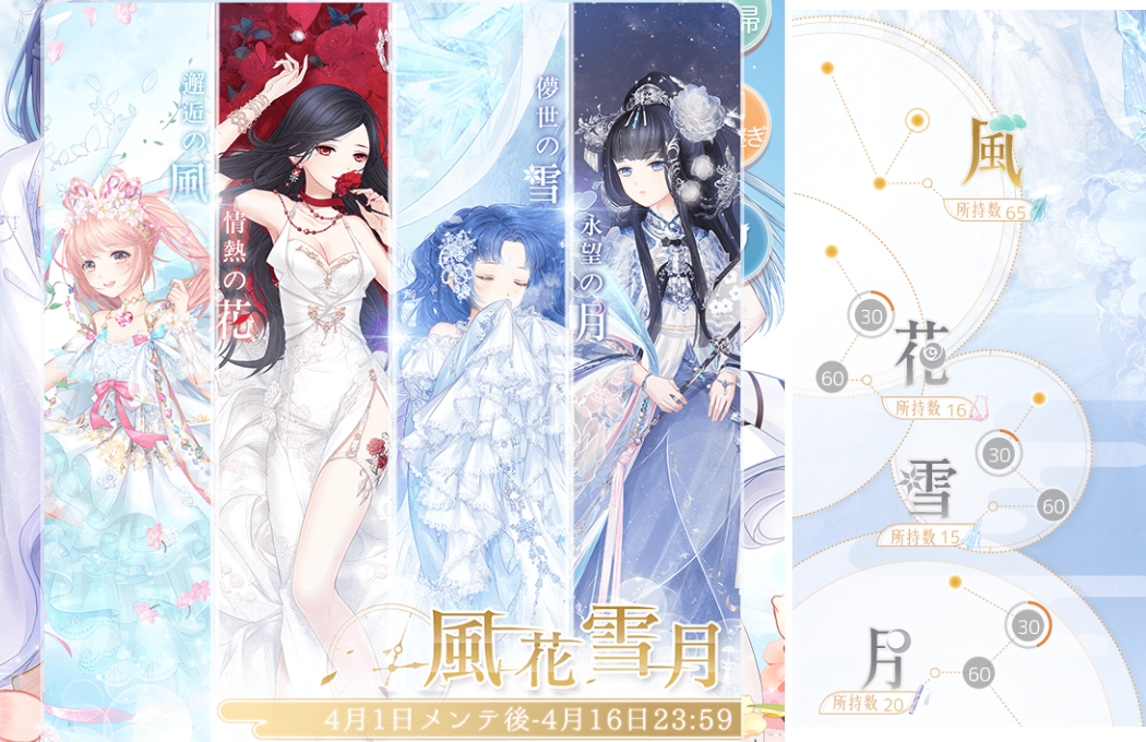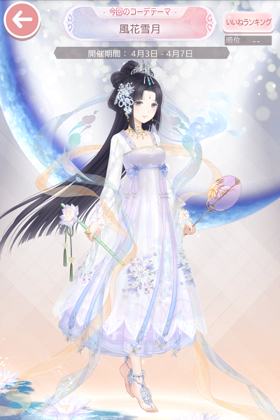 コーデお題「風花雪月」 お題2018上 2018年04月03日 Comment:0 全要素ぶっ込もうとした欲張りコーデw 「風花雪月」は日本語の「花鳥風月」に相当する中国語だそうですが 「美辞麗句に過ぎない」といった嫌味なニュアンスが含まれている場合もあるそうな。 元は中国産ゲームなので、端々に中国の息吹が感じられます。 イベント(ガチャ)のテーマでもあるのですが… 自分の途中経過も添えて貼っておきます。 初日、個人的にとても要らない子の風セットが真っ先に揃い(そういう仕様らしい) +ちょこっと回して他の3ッを第一段階までgetした時点で一旦止めました。 結構回したのに、ココに載ってないあと4つのセットコーデが 1つもコンプできていないのが気持ち悪いです。 調べたところ、第二段階で私の好きな特殊アクセサリ系(ファッションコーデ以外のモノ)が 手に入るらしいので、それぞれ全部そこまで取るのを最終目標にしようかな?と考えています。 全力出すのはココじゃない気がしましてね…と思いつつも誘惑に駆られているという。 とにかく毎日無料1回分もあるので最終日まで結論は保留だ。 あぁ、やっぱりガチャって嫌い。ストレス溜まります。 普通に欲しい物を欲しい分だけ買いたい。 どうして欲しい物が買えなくて、欲しくない物を買わされにゃならんのだ…。 さてセルフィの風花雪月ですが…自キャラに当て嵌めるなら 風→コノハ/花→サラジュ/雪→鬼琳/月→灯月 でしょうかw コーデは特に思いつかなかったのでサボります。 …追記。 後日になってやる気が出てきました。月は紫魚に変更。