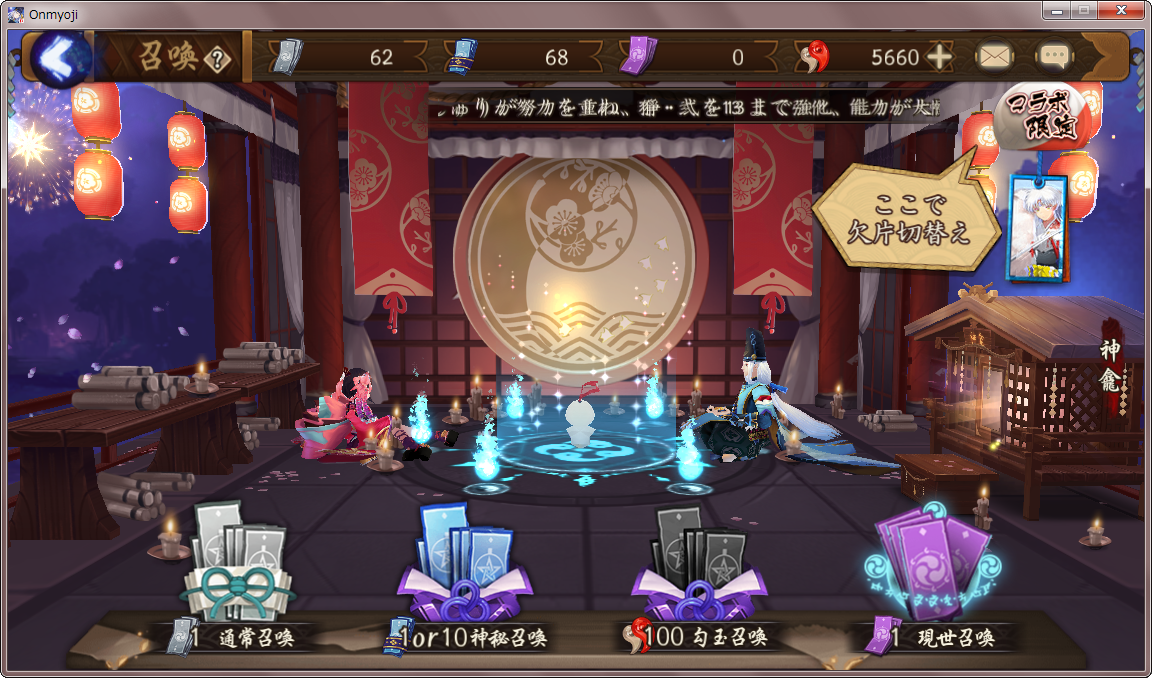 前回同様、式神召喚(陰陽師キャラガチャ)のオマケに欠片(ポイント)がランダムに貰えて