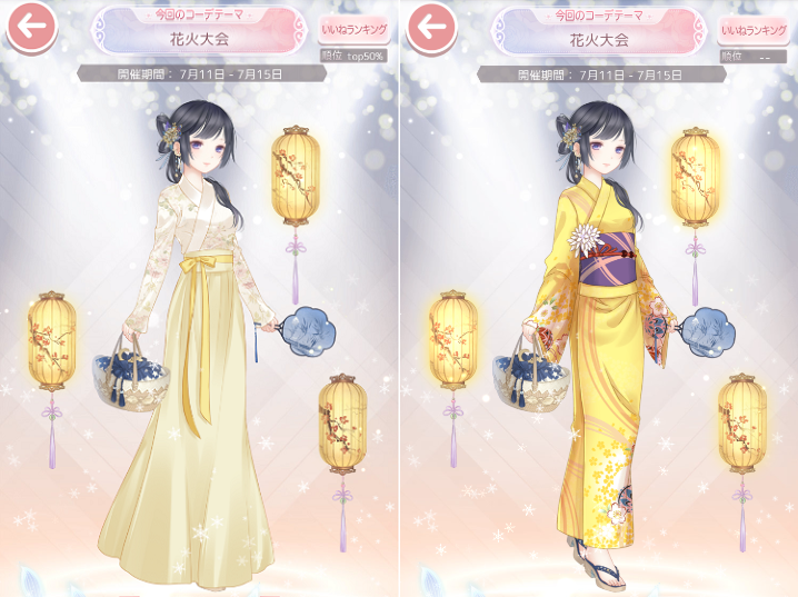 コーデお題「花火大会」 お題2017 2017年07月12日 Comment:0 籠バッグ(現在開催中の「夜空の花」イベント品)を主軸に組み立てました。 巾着部分の青色が好ましい色合いで、それに合うような黄色い着物を選んだ というのがコーデポイントです。 どっちがいいかなー?と思いながらランキングが著しく下がったら交互に上げ直してます。 コーデを評価されている訳でなく運ゲーでしかないと悟ったので 正々堂々一発勝負!なんて思いは捨てました← ミラクルニキの「コーデ品評会」という常設コーナーですが… 品評はランダムで2コーデが出てきてどっちかに「いいね」を押すという仕組みなのですが 他人と同じアイテムを使っている方が登場機会が増えて有利? と思しき挙動が見受けられるのですよね。 (同じアイテムを使った2コーデを見比べさせられる機会が多い) そもそも上位ランキングとそのコーデが確認できる、期間中何度でも上げ直しできる →上位コーデのマネができる…という仕様なので 結果似たり寄ったりなコーデで溢れ返りやすいのだろうなぁと。 よって、個性で勝負!と左のようにクラシックチャイナで花火大会品評会に参加しても 不利(初っ端で運良く高順位でも、後々ランキングが下がりやすいだろう) という予測が立つのですよ…(あくまで予測ですし自分のセンスを棚に上げてますが) だからランキング捨てて自分の思ったままを貫くか 人気のあるアイテムを使うようにしてランキングを維持しやすくするかで毎度地味に悩みますw 報酬それなりに貰いたいですしね…。 他人と同じアイテムを使っている方が登場機会が増えて有利?(あくまで推測) という仕組み…エントリーする分については別に構わないのですが 投票がつまらなく感じて飽きてしまうのがツライです。 報酬が美味しいので、つまらなくても投票はマメに参加しないといけないので困ります← うおっ長文癖が発動してしまった…。 さて気を取り直してセルフィでの花火大会コーデを添付。 花火師な恰好がしたくて…鉄砲使いの銃次朗さんに任せました。 “職人さん”って何となくカッコイイなと思いまする。