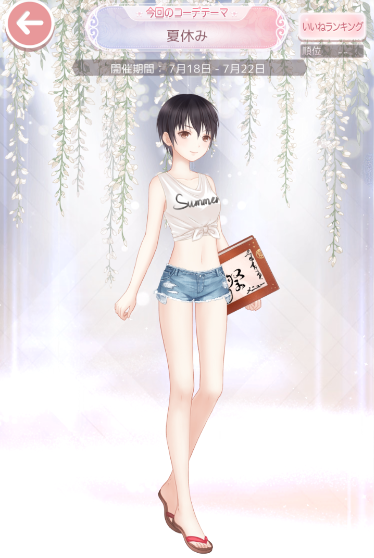 コーデお題「夏休み」 お題2017 2017年07月19日 Comment:0 学生が飲食店でバイト→海の家でバイト →浜茶屋で働く藤波竜之介くん(うる星やつら)でいこう!となりました。 ワタシにしては珍しく、アクセ類を一切盛らないドシンプルコーデですが 真夏ってアクセサリ身に付けるのも暑苦しいのでイイヤとおもいました(;´д`) 屋台付きでエントリーしたいところなのですが こーいう大型アイテムは、品評で2コーデ並んだ時に相手を隠してしまう事があり… 前後の表示は変えられるものの、申し訳ないので自重しました。 ご覧の通り、夏祭りイベントは屋台まで獲って2コーデコンプまでは走りましたが それ以上(ランキング報酬)は無視。 PLイベしかり、定価の無いモノは怖いのでスルーに限ります。 さてセルフィでの夏休みコーデは… 夏休みに入ったら実家の神社に帰ってるんじゃないか~ なんて話をしていたなと思ったのでコノハさん。 汗だくになりながら打ち水しています…。 …だめだ…あつい…しんどい…(ノд`;) 普段から愛想悪いのですが← 暫し反応にぶにぶだと思います…。