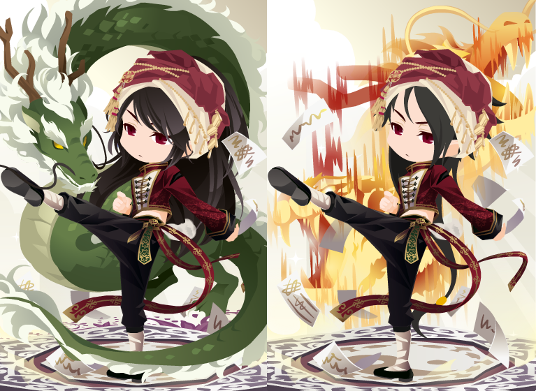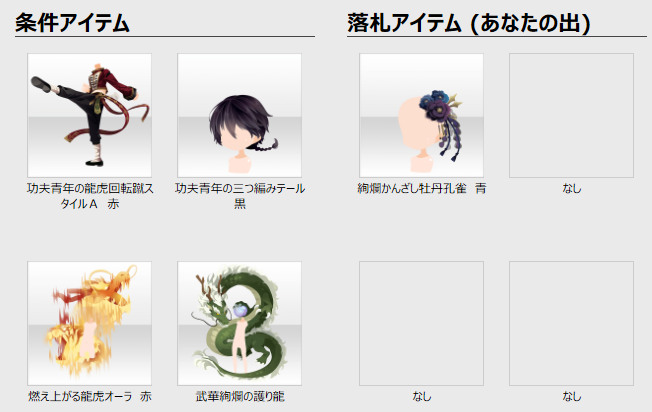 武華絢爛踊 セルフィ 2017年10月11日 Comment:0 超久々に、どれが当たっても嬉しいガチャが来ましたわ…! という訳で、珍しくガチャについてガッツリ語る。 とはいえメイン+サブで計7回のトライで(ショボ) 服以上の大物は、服1着と被らず品1つが出たという快挙でした。 被らずはこのような条件で出荷しました。サッサと乱馬になりたかったんや…! 整形可愛いから服は量産されると思ったんだがなぁ。…不人気なのか。 ワタシの美的感覚は世間様とズレているらしい。 今ガチャは被らずが価値低め、服の価値が高めになっているように思います。 服は全部欲しい勢いなんですが、3種1つずつ手に入ったら御の字という感じがします。 (現時点でチャイナドレスが手に入ってない) ザ・中華な前景が欲しいものの、そこまで回す根性も無く|д'*) 持て余している高価値品との交換か、今後の超期待薄な運にかけるか…といったところでw 暗い話はさておき、コーデをペタペタ。 念願の乱馬くんコーデ。ファンアート並みに似ていると思いますw それにしてもこのアイテムの似せっぷりは… らんま30周年記念に触発されたガチャなんじゃないかと思ってしまいます。 前景は、コレがあるからまだ我慢できるといった感じなんですよね。 150Gガチャ入りして赤髪が入っていたら泣いて喜ぶよ!(期待薄) 自キャラで一番似合うのは、太極拳の心得があるウィレンである。 死霊と対話して仲良くなるのが基本なので、バトルして気功で浄化!という機会がなさげなのですが やろうと思えばできるであろう、と。閻魔冥緋さまのお蔭で火属性が付きましたw (羽衣はまだウィレンの物になってないからととりあえず遠慮した) ちっちゃい子が体術でちょこまかがんばってるのって可愛いと思う。 右の服が自力で当てたのですよね。靴はへっぴり腰なので、ウィレンには使いません。 双樹も武器使いつつ、蹴撃できそうなんですがね。 如何せん髪が見た目に重い…。 双樹手にして戦う事はあっても、蹴り攻撃はできないんじゃないかと思いつつ コスプレ感覚で着せたくなるサラジュさん(ラブ←) やはり髪はスッキリしていた方が、躍動感あっていいですなぁ。 サラジュさんの召喚獣もめでたく増えて、地面の太極図もウィレンと双樹に欲しいデザインですし いや~本当ワタシ的に需要ありまくりなガチャでした! 追記) 比較的難度の低いチャイナドレスを入手しました! 赤でシャンプーのコスプレするのが夢だっだんですがね。 自キャラでは大陸武術仕込んで帰国した芙蓉さんに着せたかったんです。 …うん、ウチ、中国武術の心得があるようなキャラ5人も居るんです(どんだけw)