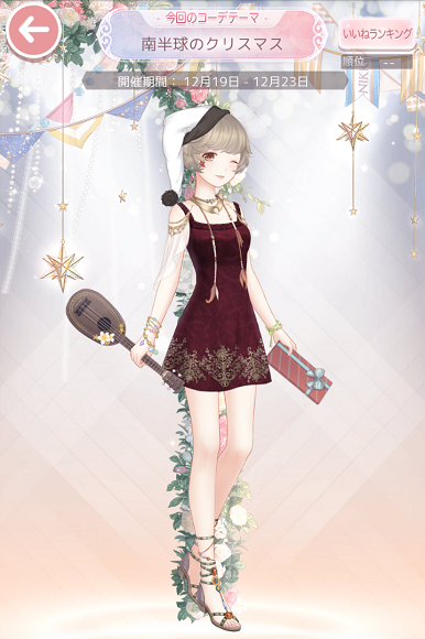 コーデお題「南半球のクリスマス」 お題2017 2017年12月19日 Comment:0 クリスマスグッズを持っていない分、クリスマスカラーを意識してコーデしました。 …いやそれ以前に「南半球の」ってw まぁ、客に飽きさせないよう週に2ツお題考え続けるのもさぞかし大変でしょう。 こんなキッカケを与えてもらわなければ、南半球のクリスマス風景をググりながら コーデ考えたりしないでしょうからねぇ。なかなか楽しいですよ\(^o^)/ さてセルフィでの南半球クリスマスは… 画像ぐーぐるしてると波乗りサンタが気になって仕方なかったです。 豪州でも定番のサンタ衣装が基本だそうですが、半袖半ズボンだったり アロハシャツ着てたり、サングラスかけてたり、水着だったり…。 モデルについてはイベントのネタバレだったりするのでサラリと流そうか\(^o^)/