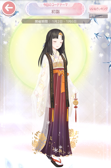 コーデお題「初詣」 お題2018上 2018年01月02日 Comment:0 やはり似たようなテーマがきましたね…。 結局ウサギと戯れるサラジュさんを替える事ができなかったのでw(最終結果Top50%台) 前回温存しておいた巫女さんらしきコーデをエントリーしました。 次点として弁財天イメージのコーデを用意したのですが いずれ出す機会があるかもしれないと思って披露しないでおきます。 コーデしているうちに、白樹さんの奥方の翠柳さんを作っている気がしてきたんですがね…(*´∀`) さてセルフィでの初詣コーデは… う~ん…昨夜の新春特別記事(笑)の疲れが祟ってコーデする気力がありませんorz 時穂先生との巫女友合わせコーデを記念に貼らせていただきます。 どちらにせよ初詣する側でなく、初詣客をお迎えする側のコーデですねw
